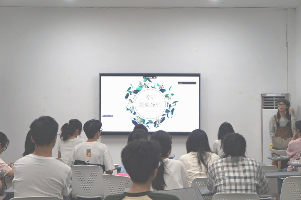 四位优秀学生代表分别分享了自己的考研经验和求职经验。考入中南大学的刘晨云从院校选择、时间规划两个方面出发,向同学们分享了自己的考研心得,并总结了自己的备考秘籍,鼓励大家保持良好的心态。随后,保研至西南财经大学的谭丝语围绕如何获得保研名额展开分享,细致讲解了保研的条件和流程,同时鼓励学弟学妹们向“六边形战士”全面发展,积极争取保研名额。在就业方面,入职深信服科技股份有限公司的傅锦程从四年规划、当前就业形势、就业准备三个方面进行具体分享,着重强调实习和成绩在求职中的重要性。最后,签约三诺生物公司的隆思则建议同学们尽早做出未来个人发展规划,并向大家介绍了获取招聘信息的主要渠道。