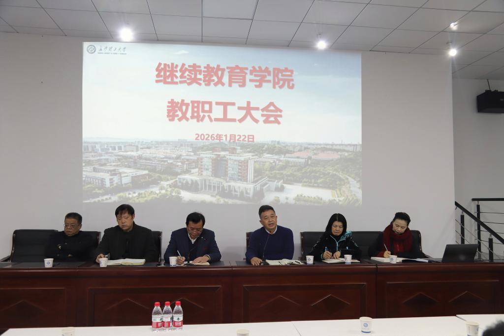 2026年1月22日上午,继续教育学院教职工大会在14教118会议室召开。大会由学院党委书记刘思强主持,全体教职工参加。