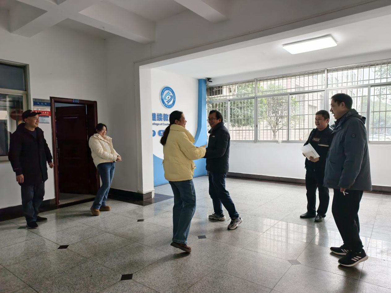 为传递节日关怀、筑牢校园安全防线,2月12日上午,继续教育学院党委书记刘思强带队深入教学楼、学生宿舍等重点区域,开展春节走访慰问及校园安全专项检查工作。学院党委副书记、副院长任艮丰,副院长易国萍全程陪同,相关职能部门负责人共同参与了慰问与检查。