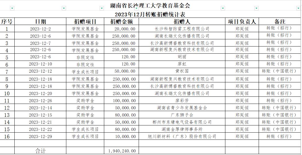 湖南省长沙理工大学教育基金会2023年12月捐赠收入表