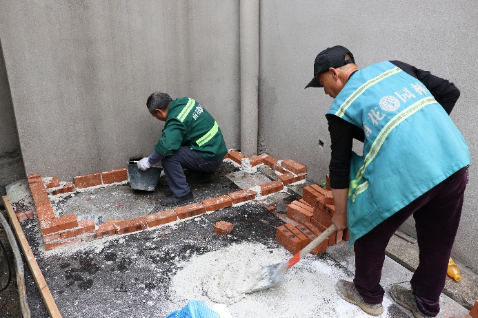 活动现场,建筑学院风景园林系老师张颖带领学生志愿者与园林局工人、居委会成员分工协作。在清杂与增肥环节,大家手持工具,拔除杂草、为土壤增肥,让花园地块重焕生机;花池建造时,施工人们精细开展砌砖抹泥工作,打造定制化花池,为花卉植物营造专属生长空间;最后墙体清洁部分,大家合力移除原有墙面构筑、细致清洁墙面,为后续票选彩绘的呈现做好充分准备。