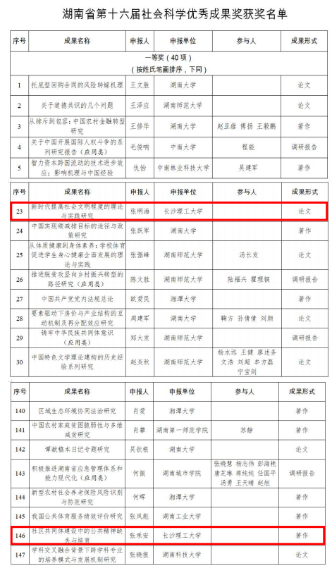 近日,湖南省第十六届社会科学奖拟获奖名单正式公示,长沙理工大学马克思主义学院再传捷报,共有两项高水平科研成果入选,且实现了一等奖的重大突破。