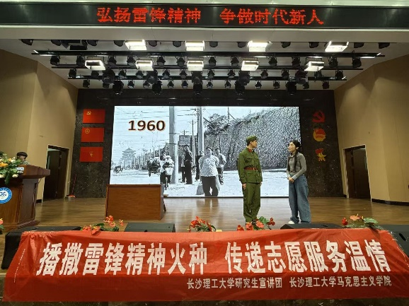2026年3月24日下午16:30,长沙理工大学研究生宣讲团“学雷锋月”小分队走进长郡雨花外国语学校,以情景剧表演与理论宣讲相结合的形式,开展“弘扬雷锋精神,争做时代新人”主题宣讲活动。宣讲团成员们用一部自编自导的情景剧《我与雷锋的那些日子3.0》,将现场300余名四年级小学生带回了1960年代,与雷锋进行了一场跨越时空的“对话”。