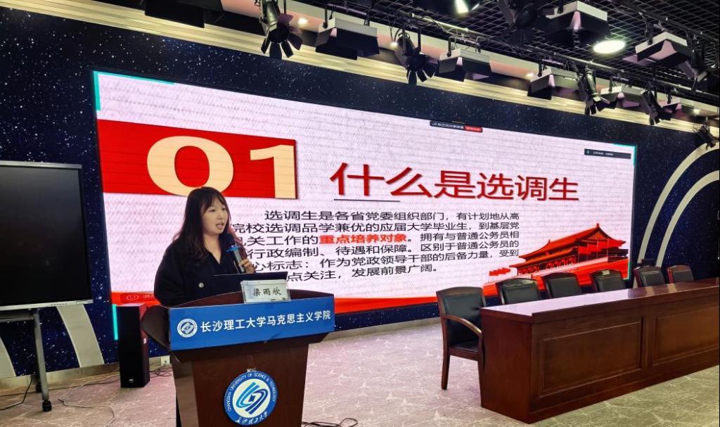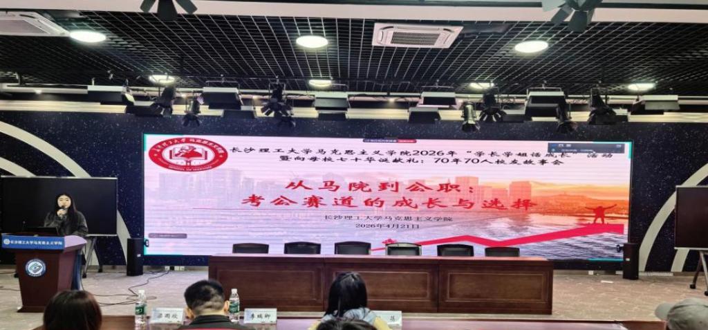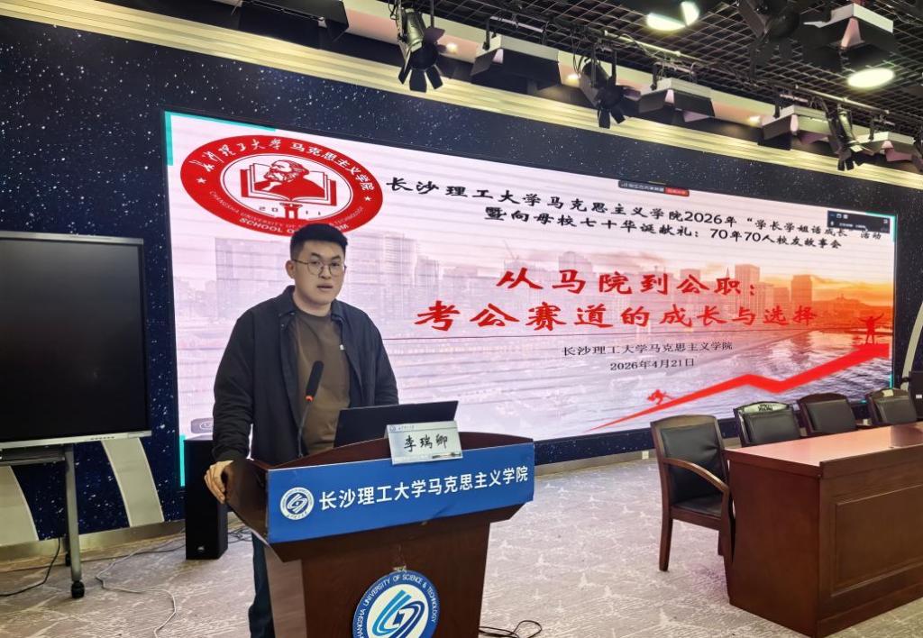 为帮助同学们深入了解公务员考试与职业发展路径,发挥优秀校友的榜样引领作用,4月21日下午2:30,马克思主义学院在云塘校区文科楼B300报告厅举办了长沙理工大学马克思主义学院2026年“学长学姐话成长”活动暨“向母校七十华诞献礼:70年70人校友故事会”。本次活动以“从马院到公职:考公赛道的成长与选择”为主题,特邀2024届哲学专业伦理学方向李瑞卿、2026届马克思主义理论专业中国化方向梁雨欣、2026届马克思主义理论专业思想政治教育方向黄蓉蓉三位成功考取公职的学长学姐分享经验。学院学工办主任、辅导员曾蓓出席活动,2025级全体研究生和2024级部分研究生参加。
