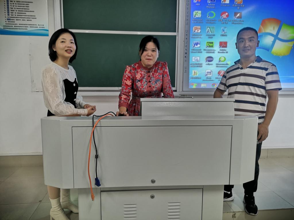 图为唐杰老师与钟芙蓉主任交流信息化教学问题
