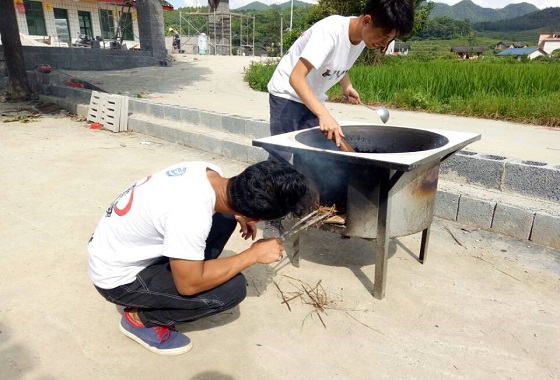 天公不作美,由于当地整体经济水平落后,当地还维持着5天赶一次集的生活方式,且修锅只能在赶集当天进行。距离下一次赶集还有4天的时间,故而从今日起志愿者们需要用柴火做饭。对于一群常年生活在“城里”的学生,户外生火做饭,大多数人是破天荒的头一遭。队员们只能一边询问村民,一边实践探索。将近半个小时的摸索,队员们终于生好了火。尽管脸上被柴火涂了一层黑炭,但想到今晚能吃上煮熟的白米饭,倒也觉得值得。