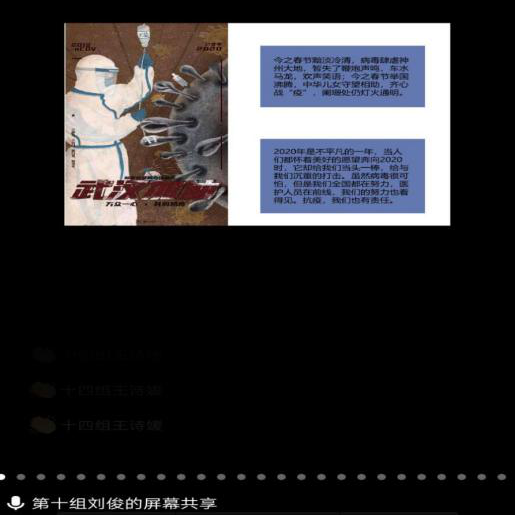 本次会议由董昭锋主持,共19名入党积极分子通过共享PPT参与分享。积极分子们对“抗疫情”做了全面的分析,分别介绍了新冠病毒及疫情的简介、当地的基本防疫情况及防疫措施、抗疫的暖心故事以及抗疫情带给我们的感悟。