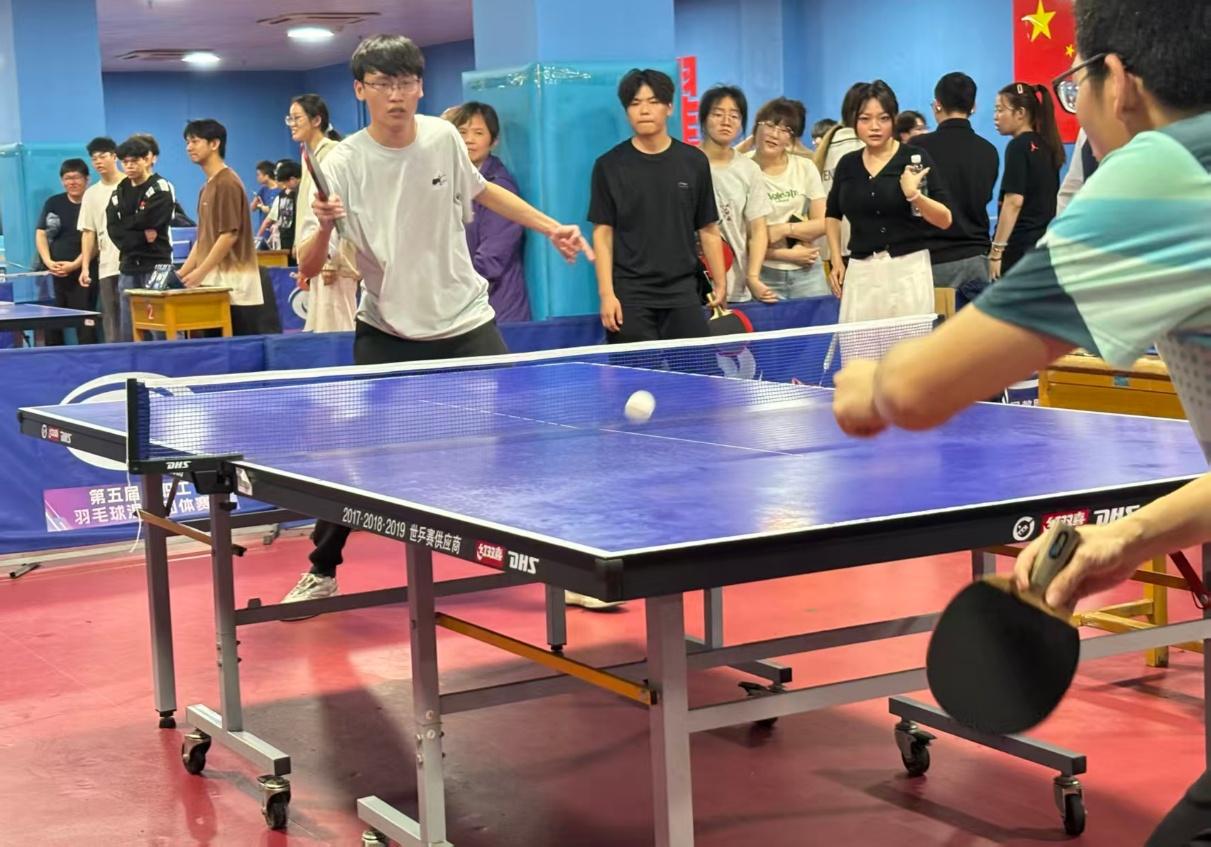 赛场上,气氛热烈,喝彩声此起彼伏。来自各学院的选手们挥拍鏖战,扣杀、削球、弧圈……精彩场面层出不穷,引得观众连连叫好。白色的乒乓球在球台上飞速穿梭,每一次有力的扣杀都伴随着场边激动的欢呼。我院参赛队员精神饱满、敢打敢拼,面对强劲对手毫不怯场,每一分都全力以赴。团体赛中,队员们默契配合、相互鼓劲,战术调整及时到位,场边队友的“好球”“稳住”喊声不断;单项赛里,大家每球必争,多次在落后情况下顽强追分,展现了不服输的斗志。尤其是在男单项目中,覃启城同学面对实力强劲的对手,在先失一局的情况下稳住心态,凭借出色的发球和果断的进攻连扳两局,虽然最终惜败,但其顽强拼搏的精神赢得了现场观众的热烈掌声。场边,我院啦啦队热情助威,加油声一浪高过一浪,辅导员老师也到场为同学们鼓劲,师生同乐、其乐融融的氛围成为赛场上一道亮丽的风景线。