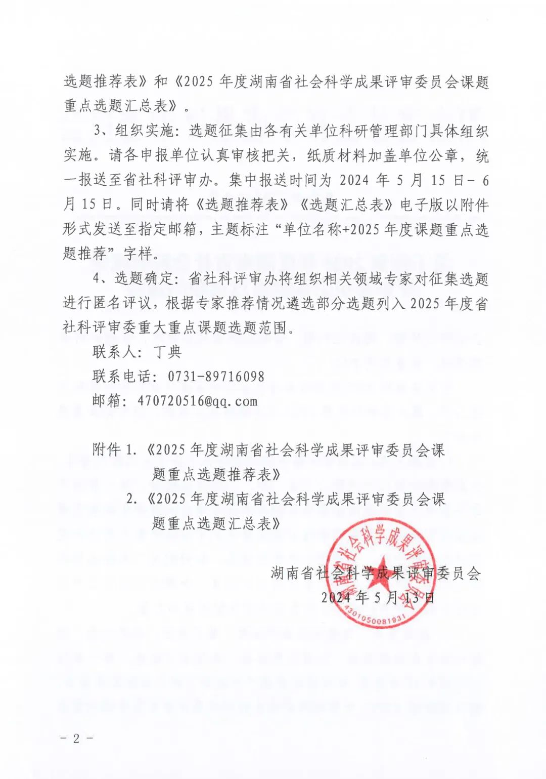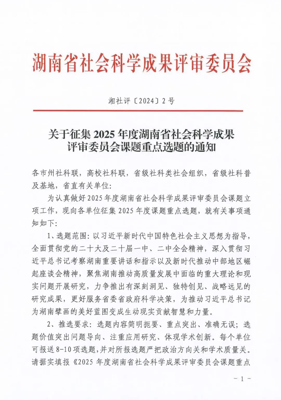 《关于征集2025年度湖南省社会科学成果评审委员会课题重点选题的通知》已公布,请需申报选题的老师按照通知要求填写,并于6月12日前将电子版发送至邮箱(1430893250@ qq.com)。