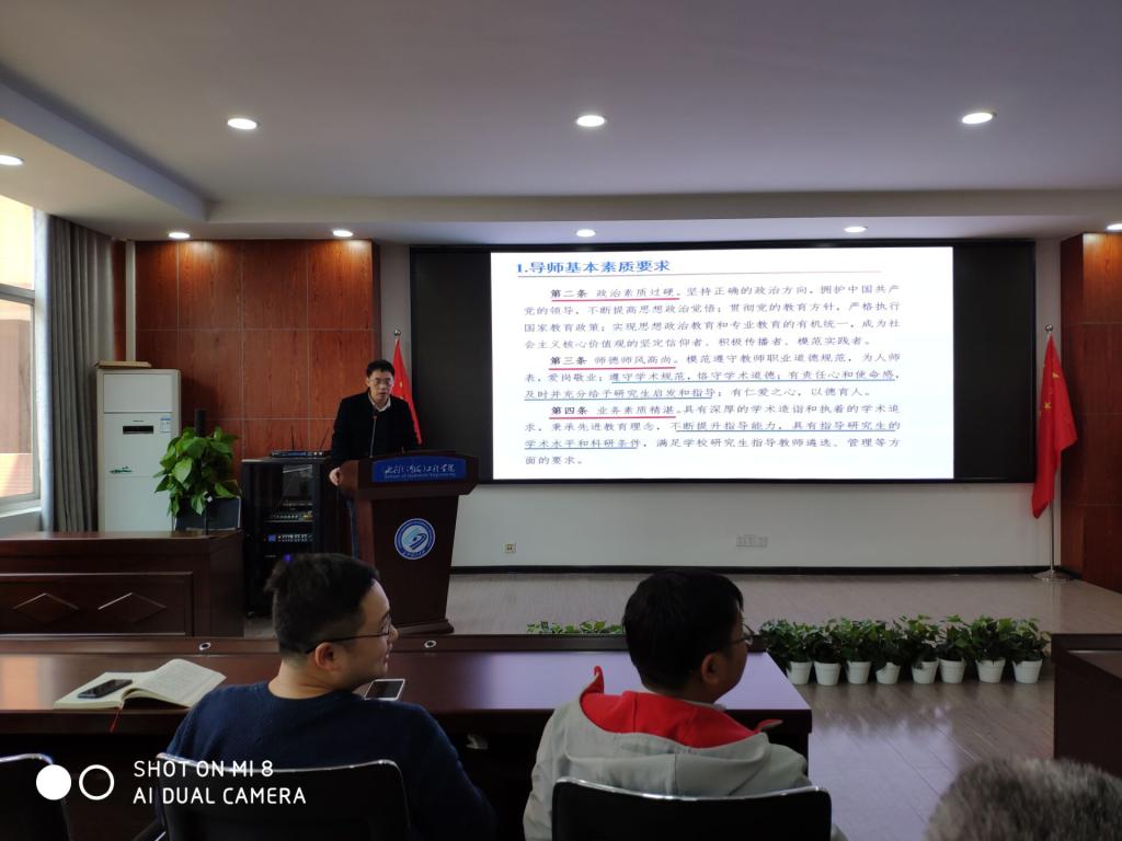 副院长蒋中明教授解读了《长沙理工大学落实研究生导师立德树人职责实施细则(试行)》文件精神,要求学院导师把立德树人作为研究生导师的首要职责,详细解读了研究生导师立德树人的“七项职责”和“十种失范行为”,并就导师“七项职责”和“十种失范行为”作为我院导师考核指标情况要求进行了说明。