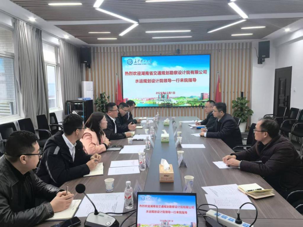 2025年12月1日下午,湖南省交通规划勘察设计院有限公司水运规划设计院院长王能、总工程师刘庆志、田红伟率队来访水利学院,并与学院领导及教师代表召开交流座谈会。水利学院院长陈杰、副院长伍志元、港航系副主任李小超、李江夏、就业指导中心副主任綦丽出席会议。
