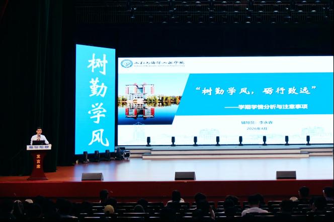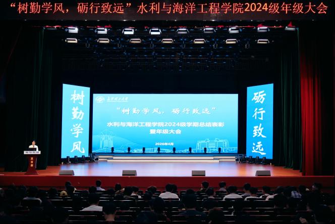 4月26日晚,水利与海洋工程学院2024级“树勤学风,砺行致远”学期总结表彰暨年级大会在云塘校区大会堂举行。学院党委副书记银波、给排水2403班班主任杨岁芹、2023级辅导员张海林、2024级辅导员李永睿出席大会,2024级全体本科生参加会议。