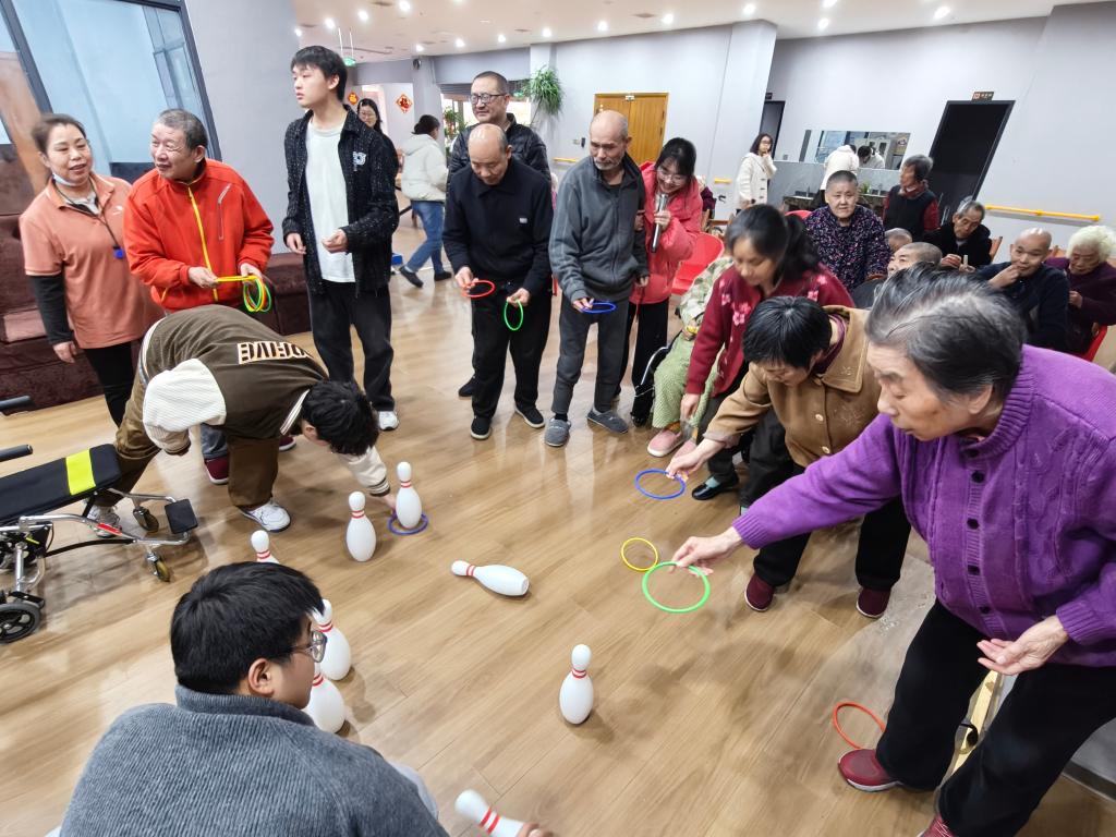 活动现场暖意融融、氛围温馨。党员志愿者与康养中心的老人们齐聚一堂,齐声唱响经典歌曲《学习雷锋好榜样》,铿锵有力的旋律回荡在活动室,既表达了对雷锋精神的崇高敬意,也拉近了青年党员与老人们之间的距离。在互动实践环节,大家携手制作草本养生足浴包,细心称量、规范封装,围坐一起边协作边话家常。志愿者们耐心倾听老人们的生活趣事与人生感悟,在动手实践中传递健康关怀,用陪伴温暖时光,让敬老爱老融入细微之处。随后的趣味互动环节将现场气氛推向高潮,套圈、塑料保龄球等简易安全的小游戏吸引老人们踊跃参与,配合默契,欢呼声与笑声此起彼伏。青年党员们以贴心的陪伴,为康养时光增添了一抹青春亮色。