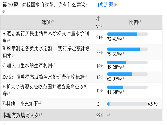 这次调研增强了居民对于阶梯水价的了解。通过调查分析得出,大多数居民对阶梯用水不了解,还需要相关部门落实阶梯水价的知识普及。大多数居民表示支持阶梯水价方案的实行,认为阶梯水价有利于节水、护水,将推进绿水青山与生态文明的建设。