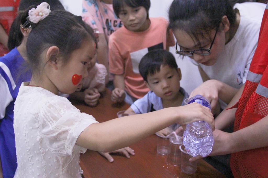 图为实践团队员为孩子们演示“扎不破的水袋”实验。邹建云 摄