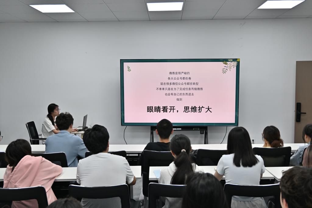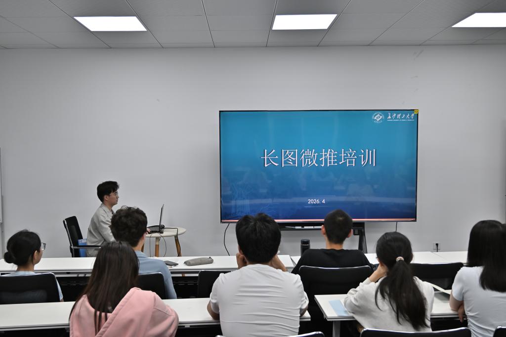 王鑫沅结合宣传案例,从标题拟定、内容结构、语言风格、排版格式等方面,讲解微推创作的基本方法与注意事项,帮助大家提升推文写作水平;殷志翔从构图、光线、拍摄角度、突出主体等方面,介绍活动现场拍照技巧,指导同学们拍出清晰、规范、高质量的活动照片;李康围绕长图制作,讲解适用场景、素材选取、版式设计、排版配色等内容,并演示制作步骤,提升大家的视觉设计与图文排版能力。三位主讲人结合自身工作经验进行分享,内容贴近实际、实用性强,现场互动积极,学习氛围浓厚。
