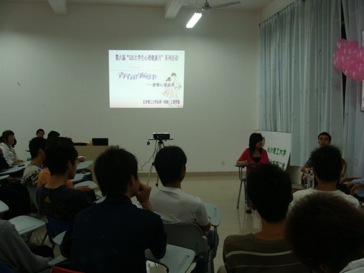 2009年6月2日晚7:00,水利工程学院在学生活动中心A-205心理团体辅导室举办心理沙龙活动。出席本次活动的嘉宾有学校心理咨询室经验丰富的陶传谱老师、我院学工办李旭老师和一对学生情侣,到场参与人员有各班心理委员及班级同学。本次活动响应“525大学生活心理健康系列活动”主题——认识爱、理解爱、学会爱,旨在通过师生之间的交流,帮助同学们树立正确的恋爱观。