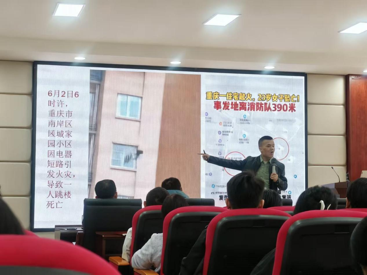 为强化警示效果,曾灿教官结合近年来国内典型火灾案例,深入剖析了安全隐患忽视、自救技能缺失等事故诱因,直观展示了消防安全意识淡薄可能造成的严重后果。他重点围绕火灾初期扑救、浓烟环境逃生、人员疏散避险等实用场景,系统讲解了弯腰低姿前行、湿毛巾捂鼻、安全出口识别等科学自救方法,用贴近生活的实例让在场师生深刻认识到掌握应急技能的重要性。