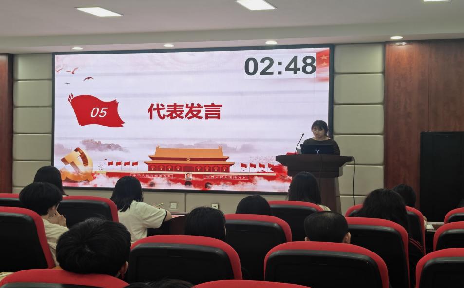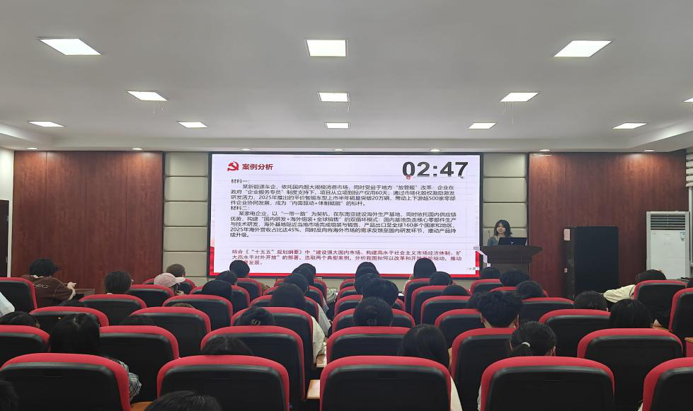 分享会设置了“知识抢答——理论微宣讲——小组研讨——代表发言——案例分析”五个环节。理论微宣讲环节,研究生第二党支部顾紫檬领学,从内需引擎、制度基石、开放格局三个维度,系统解读党的二十届四中全会精神与“十五五”规划核心要义,深入阐释消费提振、统一大市场建设、要素市场化改革、高水平对外开放等关键部署。