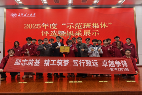在刚刚落幕的长沙理工大学2025年度“示范班集体”评选暨风采展示活动中,我院智卓2201班展现出昂扬的精神风貌,在全校23个进入决选的班级中脱颖而出,以总分第二的成绩荣获“示范班集体”称号。
