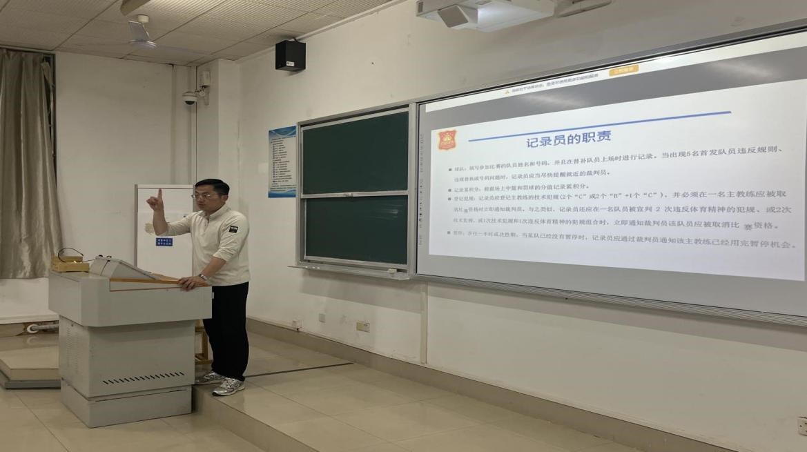 为规范我校园篮球赛事记录台工作,提升工作人员业务水平,保障比赛公平有序开展,2026年4月18日晚7时,“篮球比赛记录台工作流程和规范”专题讲座在云塘校区云综教A-101举行。体育学院群体中心主任张柏铭担任主讲,篮球协会成员、记录台志愿者及篮球爱好者共百余人参加学习。