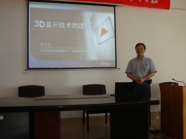 2010年6月11日下午,中山大学光电材料与技术国家重点实验室主任蔡志岗教授,应邀在云塘校区理科楼B-513为物理与电子科学学院师生做了一场关于《3D显技术的进展》的专题学术报告。报告会由物电学院院长唐立军教授主持,物电学院相关方向的教师、部分研究生及本科学生近100人参加了会议。
