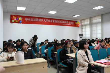 2017年12月19日下午,上海续蕊美妆公司董事长、我校优秀校友许磊女士为学院学生作《移动互联网时代大学生就业趋势及如何自主创业》报告交流并受聘为学院创业导师,本次报告交流活动在文科楼C202举行。文法学院院长王新生、文法学院副院长周云鹏、党委副书记魏桃初以及学工办辅导员楚艳鸽老师出席本次讲座。