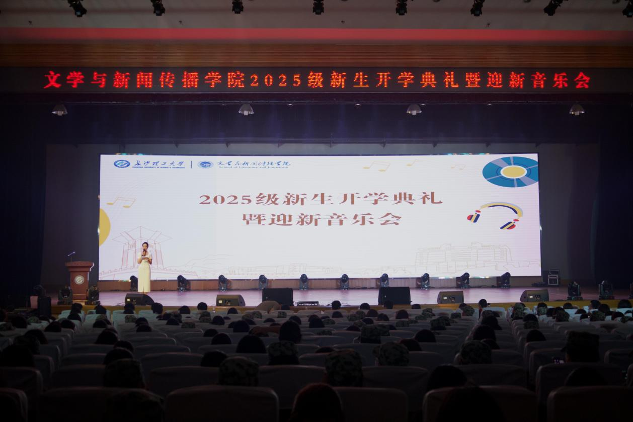 2025年9月28日晚,长沙理工大学文学与新闻传播学院在金盆岭校区5教大礼堂举行2025级新生开学典礼暨迎新音乐会。全体院领导、系主任、系副主任、支部书记、全体辅导员、2025级本科班级班主任以及下班党员下班团干出席活动。文新25级研究生张雨嫣、新媒体2501班王佳妮以及新闻2502班粟嘉淇担任主持。