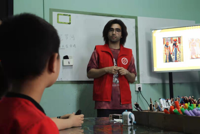 埃及留学生Omar则向小朋友展示了尼罗河畔的风土和人情。“Our Egypt kids are same with you.”介绍埃及特色富尔合塔米亚、达伍芭莎等美食后,Omar提及了金字塔的由来,并和孩子们分享了埃及儿童过六一的方式。