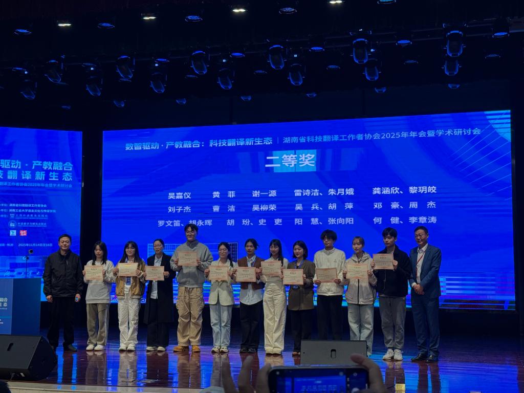 2025年11月14日—16日,以“数智驱动·产教融合:科技翻译新生态”为主题的湖南省科技翻译工作者协会2025年年会暨学术研讨会在制造名城株洲隆重举办。本次会议由湖南省科技翻译工作者协会主办,湖南工业大学语言文化与传媒学院承办,吸引了全国各高校诸多知名学者、市州科技翻译协会与其他院校等会员代表、全省科技翻译工作者代表和部分研究生共近200人参加大会,共探数智时代下科技翻译的创新路径与未来发展方向。年会通过主旨报告、分组论坛、英才论坛等多元形式,围绕“数智时代与人机交互翻译”、“Gen时代的科技翻译教育”等核心议题深入交流,搭建起高水平学术协作论坛。