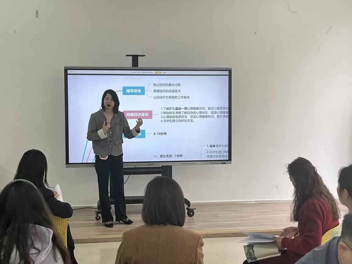 团体辅导的第一个环节,易敏首先从辅导目标、回访过程、谈话技巧、注意事项等方面进行工作培训,并对本次团体辅导的环节设置进行介绍。接着进入团体辅导的第二个环节,老师们三人一组,依次分角色扮演回访老师、参加回访学生和观察者,通过角色模拟回访全过程,在实际体验中帮助老师进一步厘清在回访中如何做好建立关系、收集信息、评估建议和心理赋能。在团体辅导的分享环节中,老师们踊跃发言,围绕细节设置、沟通策略、关注重点等展开热烈讨论,相互交流经验、补足短板,进一步提升实操能力。能动学院心理辅导员彭博、化学学院辅导员陈鑫宇在10分钟的现场示范模拟中,从开场关系建立、问题引导、倾听回应到信息反馈和收尾结束,清晰完整地呈现了普查回访全流程。