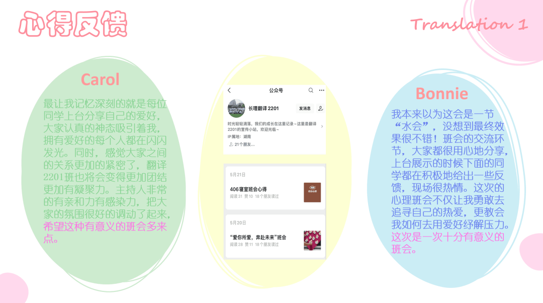 首先,翻译2201班的贺佳成同学和文卓妮同学为大家展示了他们的兴趣爱好。
