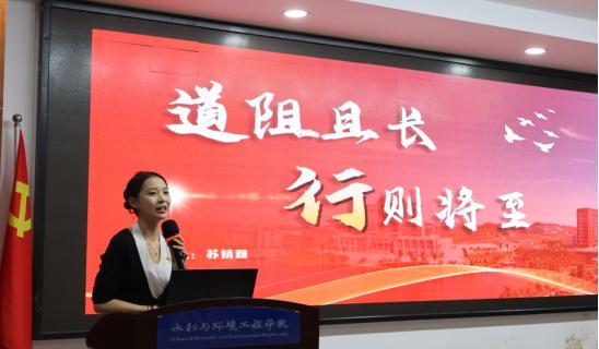 杜春艳作总结发言。她指出,环境工程专业在考研、保研、就业等方面涌现众多优秀学生,鼓励24级新生们向优秀学长学姐们学习,内外兼修、全面发展,学好专业知识,练就过硬本领,以实际行动投入到建设绿水青山中去。