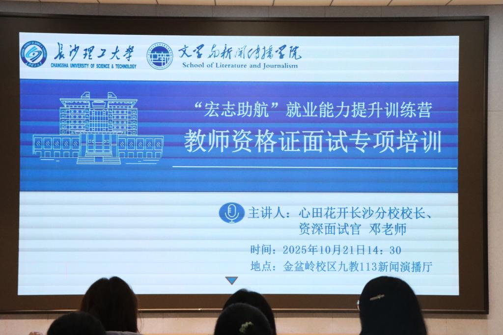 10月21日下午14:30,长沙理工大学文学与新闻传播学院特邀心田花开长沙分校校长邓老师,于九教113新闻演播厅举办“教资面试通关秘籍:从考生到准教师”培训讲座,共139名学生参与活动。本次讲座通过多形式教学向文新学子分享面试技巧,送上教资通关“秘籍”。