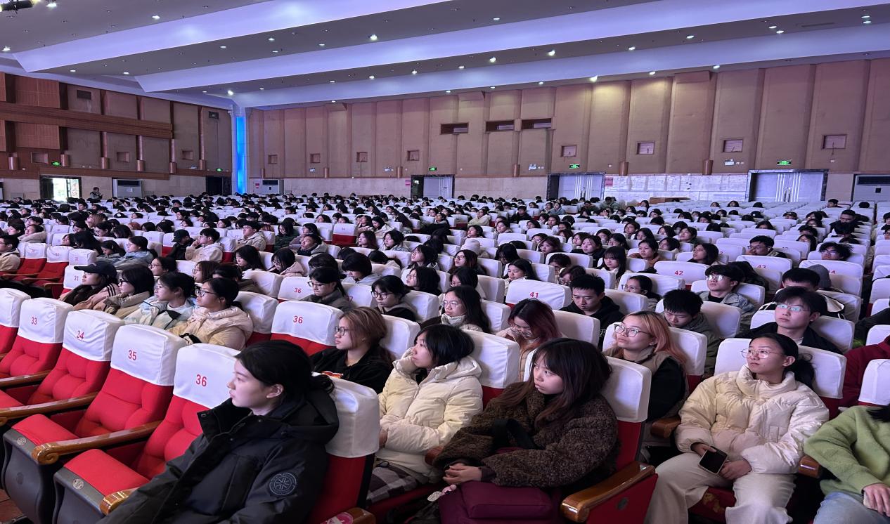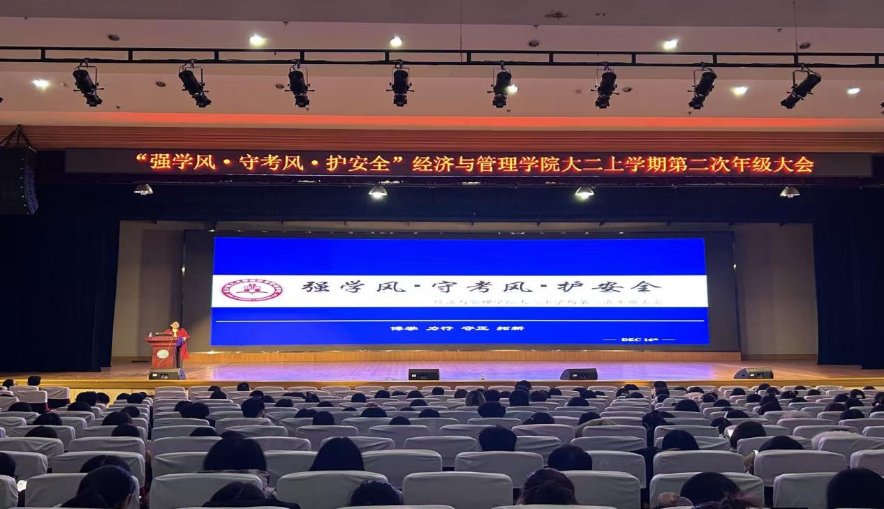 2025年12月16日下午,经济与理管学院在金盆岭校区五教大礼堂召开“强学风、守考风、护安全”2024级年级大会。本次大会由年级辅导员何艳芝主持,学院党委副书记汪功伟、辅导员钟超和全体2024级学生参加。