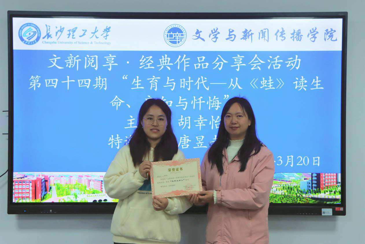 3月20日晚19:30,文新学院第四十四期“文新阅享·经典作品分享会”在金盆岭校区九教223团体成长辅导室顺利举办。本期活动由汉语言2401班胡幸怡同学主讲莫言的经典作品《蛙》,围绕时代、人性与生育命题展开深度交流,中文系唐昱老师作为本次分享会的特邀嘉宾参与活动。