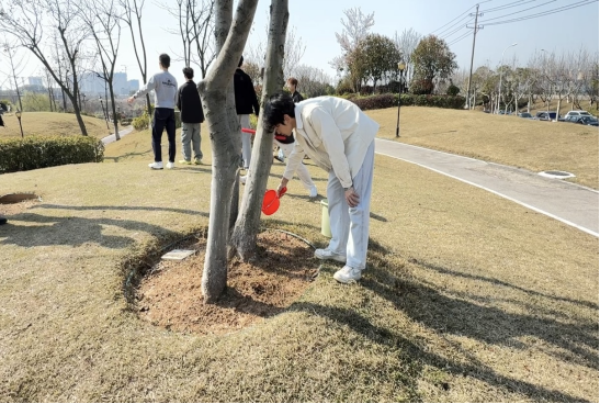 基础清洁工作完成后,公园内的绿植养护现场同样热火朝天。同学们提着水桶为树木浇灌补水,蹲在花坛边小心翼翼地拔除杂草,指尖轻抚嫩绿的枝叶,动作轻柔却干劲十足。“这些绿植不仅美化环境,还能固土防沙,和我们水利专业学的水土流失防治知识息息相关!”水利类2401班阳航同学一边拔草,一边和身边的同学交流,“把课堂上学的水生态知识用到实践中,才真正明白‘守护一江碧水’的意义。”同学们在养护过程中,围绕植被配置、生态护岸等专业问题展开探讨,让志愿服务成为专业学习的“第二课堂”。