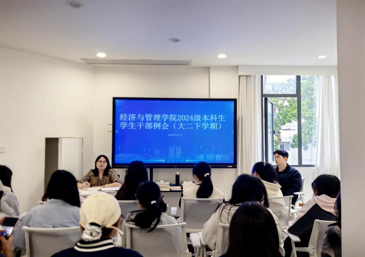 为优化干部工作模式、强化队伍建设、筑牢校园安全防线,经济与管理学院于2026年4月7日下午14:30在金盆岭校区一站式服务中心经世管界召开2024级本科生学生干部例会。本次会议由年级辅导员何艳芝、钟超主持,2024级部分学生干部参会。
