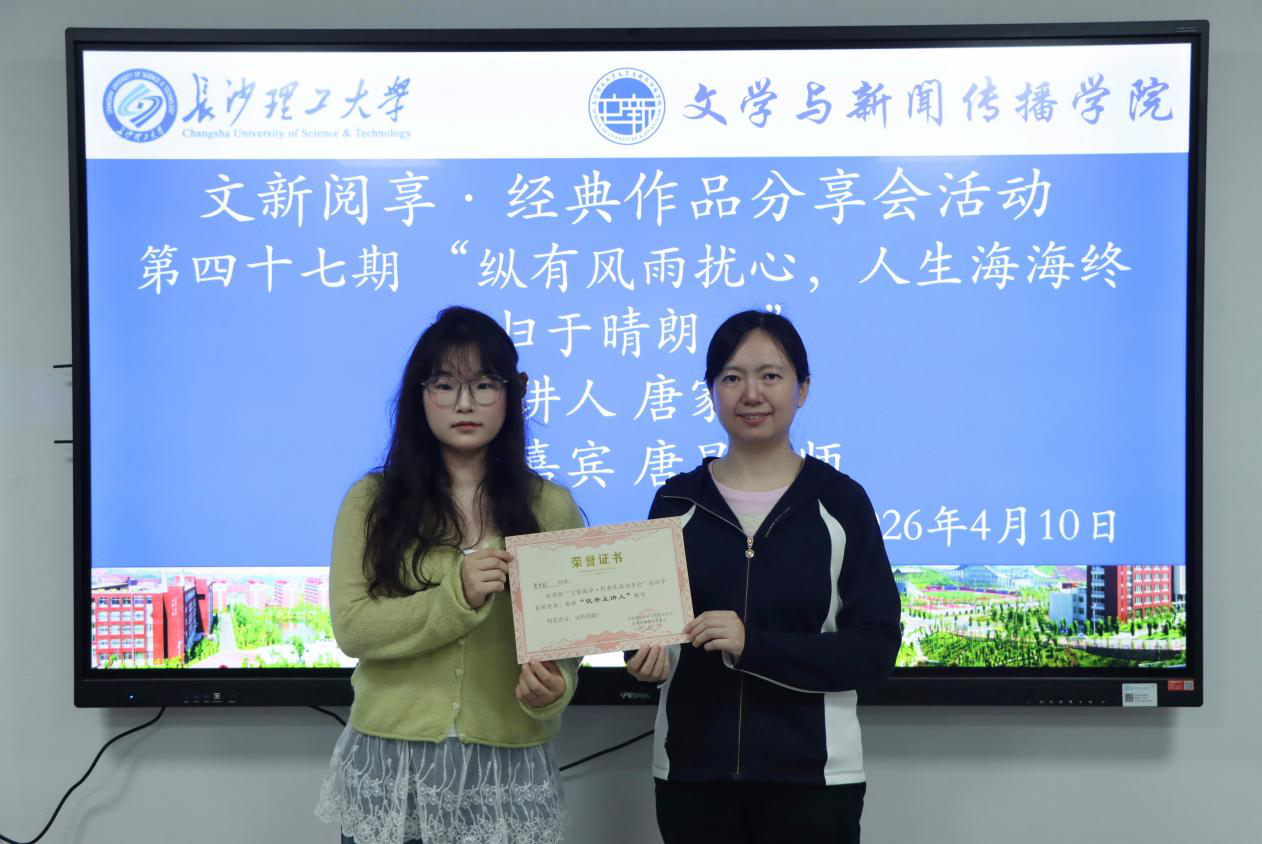4月10日晚19:30,文学与新闻传播学院第四十七期“文新阅享・经典作品分享会”在金盆岭校区九教223团体成长辅导室顺利举办。本期活动由汉语言2401班唐家歆主讲,以“纵有风雨扰心,人生海海终归于晴朗”为主题,与同学们共读麦家转型力作《人生海海》。中文系唐昱老师作为本次分享会的特邀嘉宾参与活动。