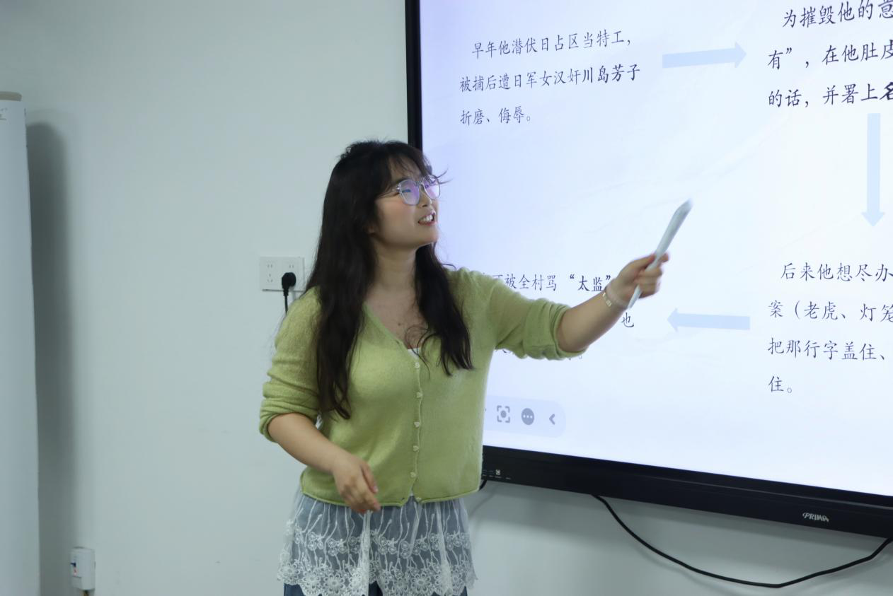 在人物品读与主题深析环节,唐家歆结合原文细节,提炼出上校仁厚、从容、纯粹的珍贵品格,并由此解读其身上的三重人生修养:锋芒藏于骨、低调显格局的处世智慧,委屈淬于心、温柔渡众生的至善底色,疯癫为解脱、与命运和解的通透修行。分享过程中,她设置“真正的强大是锋芒毕露还是内敛低调”“活着为何比死去更需要勇气”等互动问题,引导同学们结合文本与现实生活交流思考,现场氛围热烈,思想碰撞充分。特邀嘉宾唐昱老师也参与交流探讨,并分享道:“这本书题材深刻,极具现实意义。希望大家通过阅读领悟书中的人生哲理——人生就像大海一样,总会起起伏伏。只有经历风浪与沉浮,才能真正懂得生命的韧性与宽广。”
