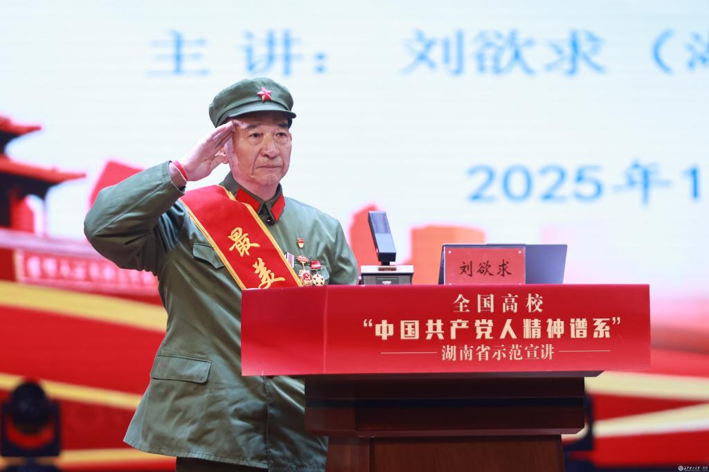 南疆戍边老兵、湖南省最美退役军人刘欲求结合自身经历,生动诠释了爱国主义与革命精神在新时代的传承。他以一名老党员、老战士的深情视角,讲述了军旅生涯中淬炼的忠诚与担当。退伍后,他初心不改,开展数百场宣讲、编写战地记忆手册,让英雄故事代代相传。他勉励青年学子:“要树立远大理想,永远听党话、跟党走,争当新时代的奋斗者,努力掌握为人民服务的过硬本领,将智慧与力量献给强国建设与民族复兴伟业!”
