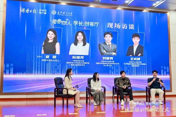 学生分享环节,长沙师范学院学生王栎然和湖南科技大学学生陈佳平分别讲述了创作背后的感悟。现场访谈环节,一等奖得主、来自湖南师范大学的阮媛芳分享了自己的创作经历和心得:“不要只会记录,要会讲故事”。我校“创业学长”王成博则表示,感谢母校的学科资源和创业孵化支持,让自己少走了很多弯路。
