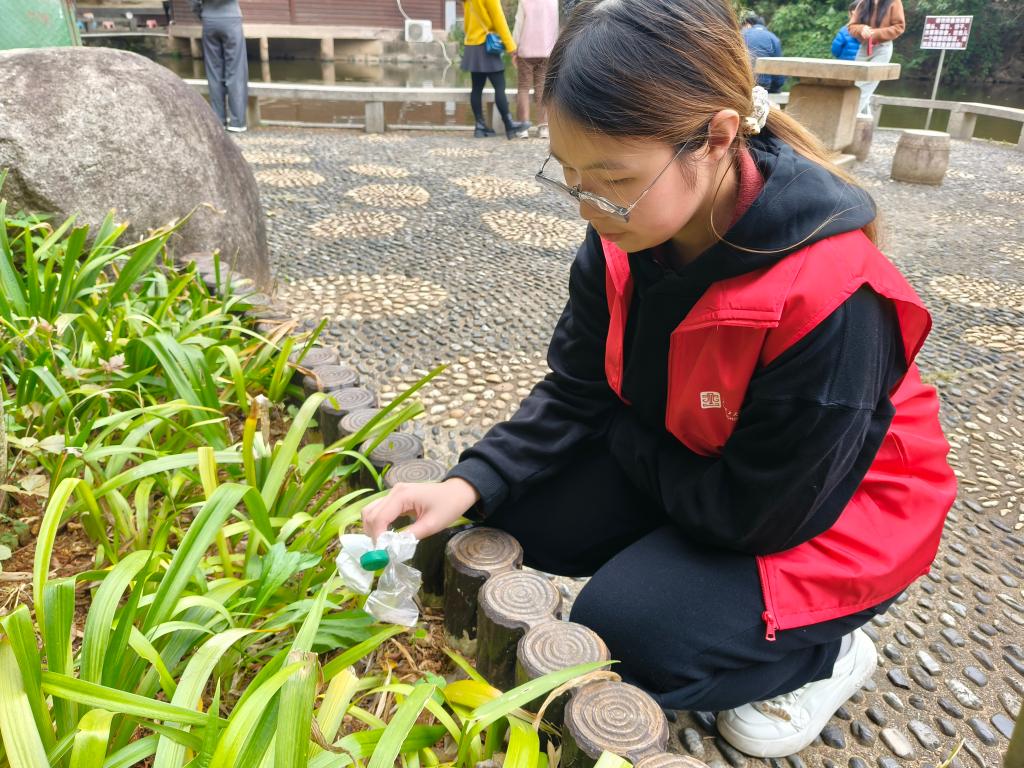 在“法心愿”志愿服务实践环节中,大家身着红色马甲,分散行动,沿着公园主干道和绿化带巡查,弯腰捡拾隐藏在草丛、石缝中的废弃物,维护英雄纪念塔的洁净庄严。