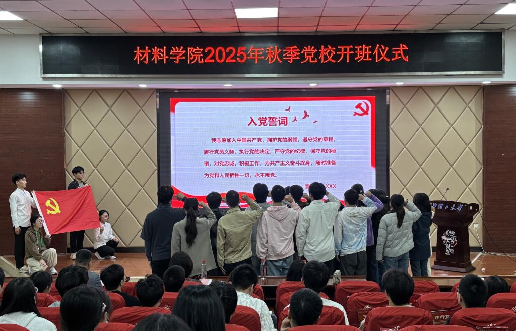 10月26日19:00,材料学院2025年秋季党校开班仪式在文科楼A200举行。学院党委书记郑延恒、党委副书记邵巧艳、党建辅导员谭方林、团委书记陈飞出席仪式,全体72名党校学员参加。