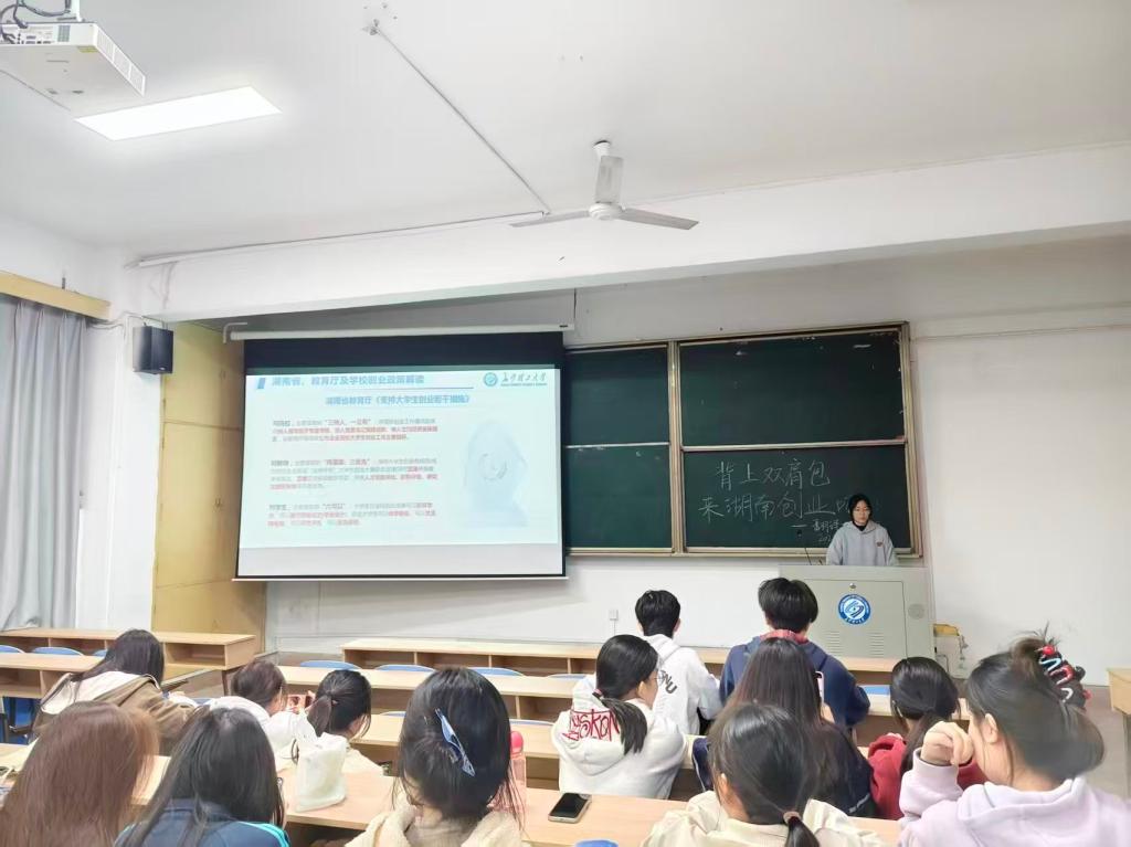 近日,外国语学院组织全院各班级开展“背上双肩包,来湖南创业吧!”主题班会,通过政策解读与资源优势介绍,为学子创新创业注入强劲动力。