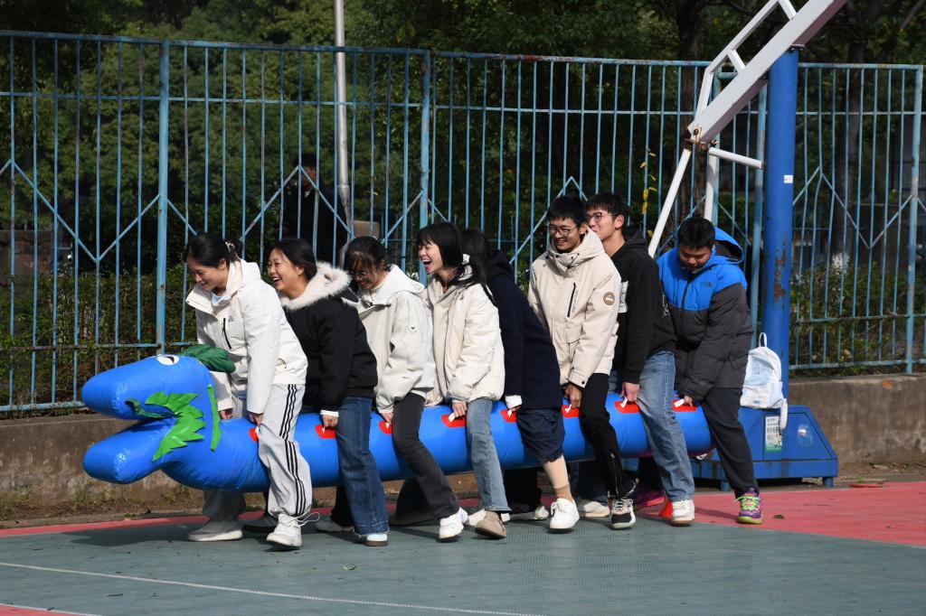 此次活动共设置“龙舟竞速”“珠行万里”“呼啦圈传递”“搬石过河”“九人十足”五个富有趣味性与协作性的团队游戏项目。活动开始前,李心怡进行开场讲话,鼓舞同学们的士气。随后,同学们在紧张激烈的氛围中积极投入、默契配合,进一步增进了彼此的情谊。现场气氛热烈,游戏环节互动丰富,充分展现了新生的活力与朝气。来自汉语言2502班的唐莹莹表示:“起初大家还有些拘谨,但通过几个游戏的共同努力,彼此很快熟悉起来。”