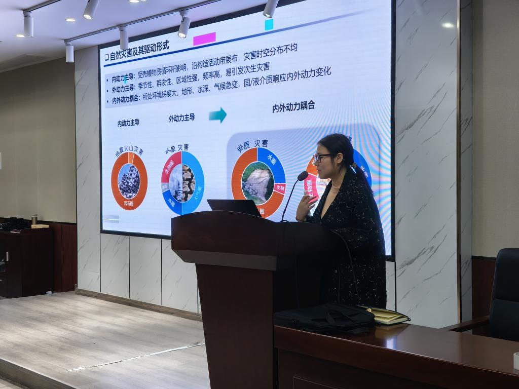 讲座中,蒋祯妮围绕四大核心内容展开系统讲解。她介绍了地质灾害的基本概况,引导同学们建立对灾害类型的整体认识;讲解了地质灾害的常规研究方法,并重点阐述了遥感技术与机器学习结合带来的研究新路径。她还结合典型研究案例,深入剖析了遥感在灾害识别、机制解析、易发性与风险性评估中的实际应用,以生动易懂的方式展现了技术融合带来的科研突破。