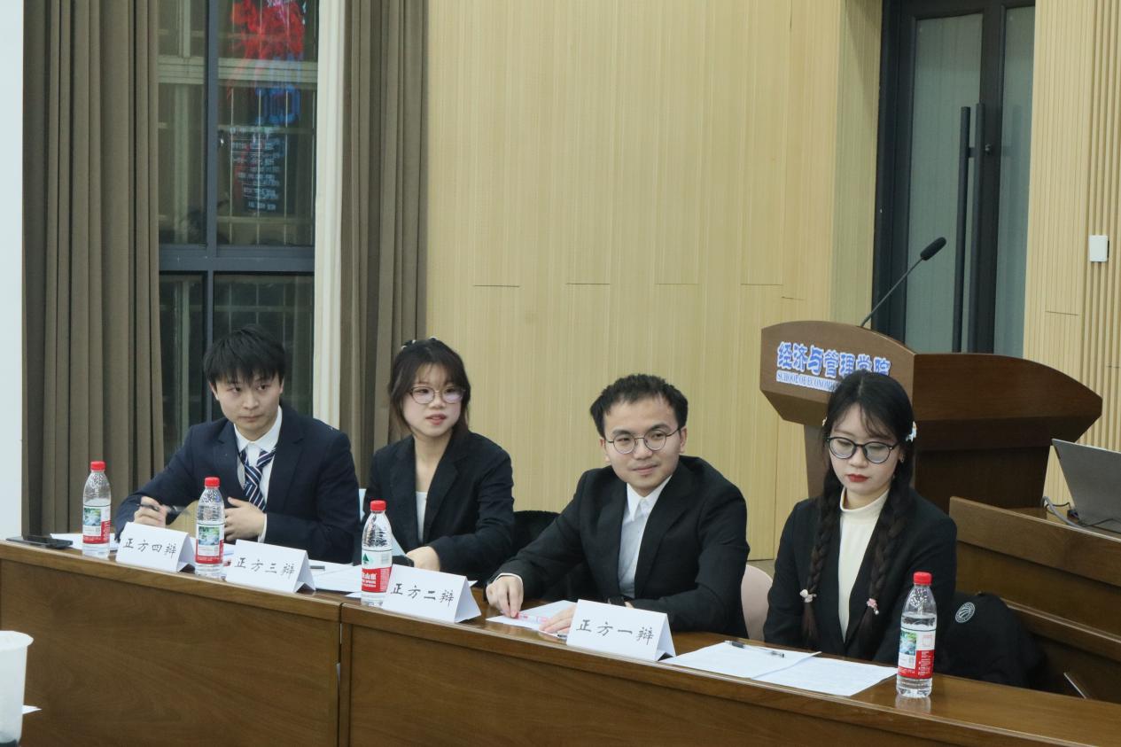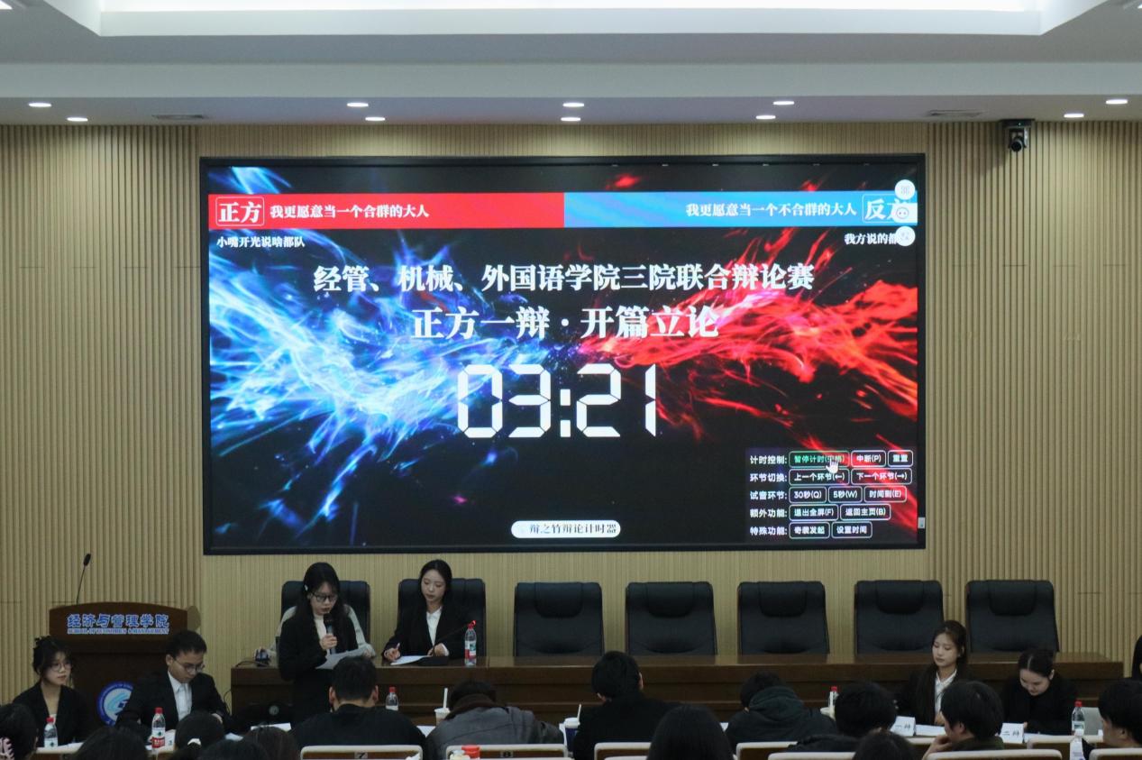 为丰富校园文化生活,搭建跨学院交流平台,12月26日晚,经管学院联合机械学院、外语学院在经管大楼100报告厅举行三院联合辩论赛决赛。经过小组赛和半决赛的激烈角逐,来自经管学院、外语学院的四支代表队晋级决赛,围绕季军与冠军展开两轮精彩交锋。现场气氛热烈,思辨交锋不断。