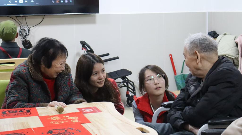 互动环节趣味十足,志愿者与老人们共同参与“击鼓传花”游戏,欢声笑语中拉近了彼此距离。大家携手完成金福拓印,一幅幅饱含吉祥寓意的作品,传递着青春与夕阳的温情碰撞。活动尾声,志愿者分组陪伴老人唠家常,细致关怀、贴心陪伴,让老人们感受到家一般的温暖 。