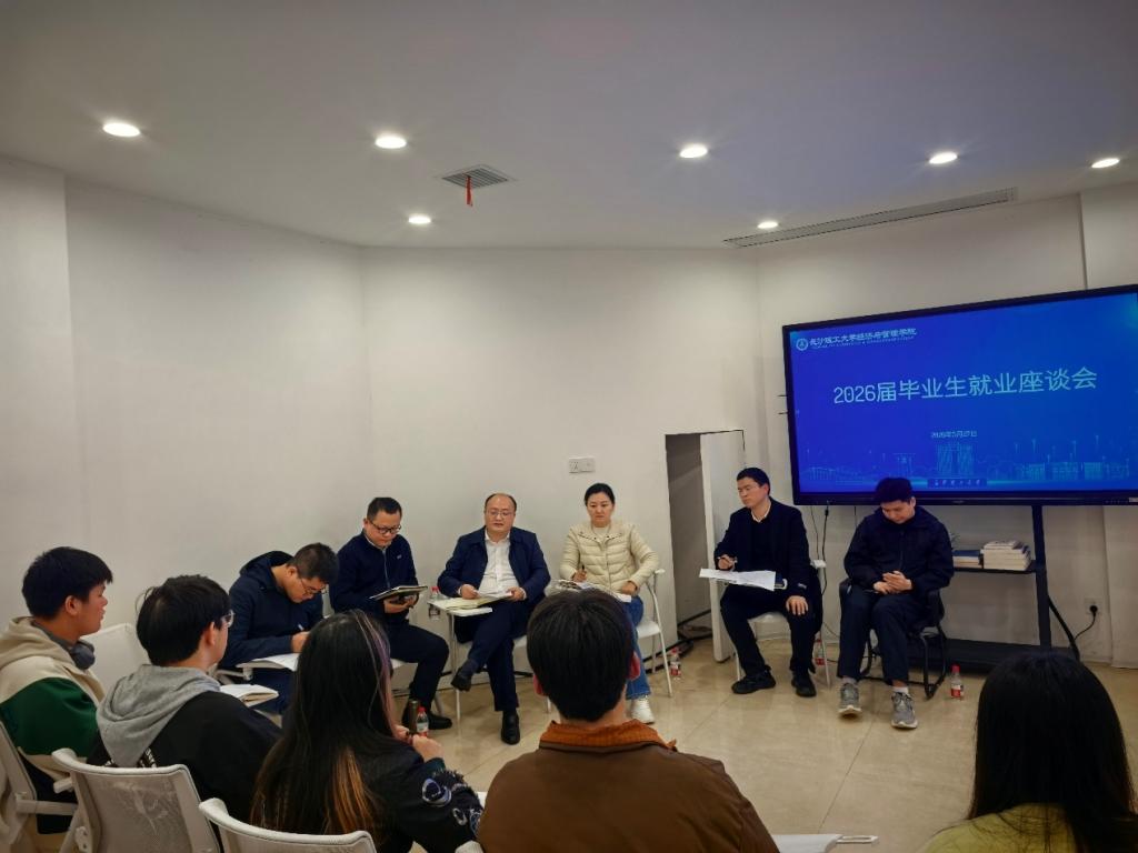 3月27日下午,经管学院在“经世管界”一站式育人社区召开2026届毕业生就业座谈会。院长彭新宇,党委书记马丽,党委副书记汪功伟,就业专干王宝宝,毕业班辅导员叶鑫、何涛参加会议,与毕业生代表面对面交流,以“现场办公、精准对接”的形式,切实打通就业服务“最后一公里”。